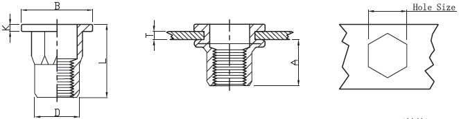 Lar / Produtos / Nozes de rebite cegas / Cabeça plana Interior-HEX Body Rivet Nut / Cabeça plana semi-hex corpo de rebite / Aço de cabeça plana semi-hex corpo porca de porca aberta